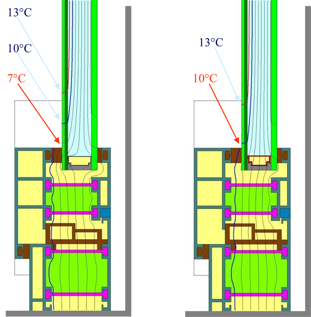 Промерзание однокамерного стеклопакета с низкоэмиссионным стеклом, равно как и выпадение конденсата, происходят в нижней части окна по краю. Причина скрыта в дистанционной рамке. (ситуация справедлива и для двухкамерных