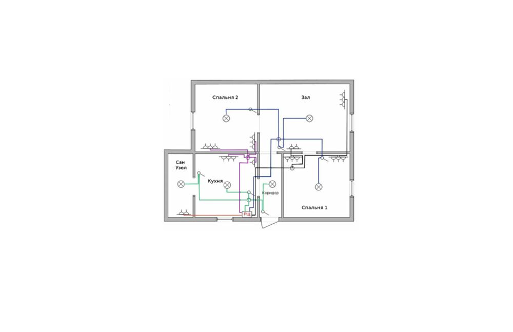 - Жилые помещения. Если в зале есть разные типы подсветки, желательно обеспечить отдельную группу проводки. Когда в зале и спальне по 1-2 люстры, их можно объединить. На количество разводок влияет загруженность электросети техникой. Площадь больше 100 м2 нуждается в установке 3 устройств защитного отключения.