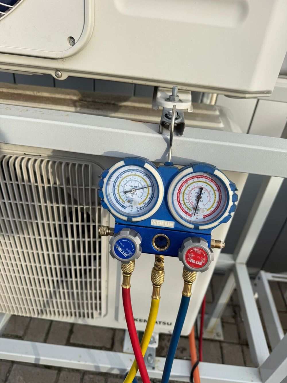 Первым делом мы провели диагностику. Манометры показали заметный недозаправленный контур, и стало понятно, что без поиска утечки тут делать нечего. Использовали три метода — опрессовку азотом, электронный течеискатель и мыльный раствор для подтверждения точки. Утечка оказалась на вальцовочном соединении трассы. Ошибка монтажа, перегрев при пайке — вариантов много, но факт один: соединение уже не держит.