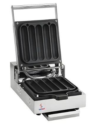 Вафельница для корн-догов – прибор, который позволяет готовить ровные и хорошо пропеченные корн-доги без фритюра. Рабочие формы представляют собой продолговатые углубления с рельефом: тесто равномерно распределяется внутри, обволакивает начинку и при запекании превращается в плотную, слегка хрустящую оболочку. Нагрев идет с двух сторон одновременно, поэтому корн-доги пропекаются быстро и без подгораний, а готовое изделие получается одинаковой формы и структуры: удобно для быстрой подачи и большого потока гостей. Закрытая форма позволяет начинке (сосиске, сыру или их сочетанию) прогреться полностью, сохраняя сочность.
