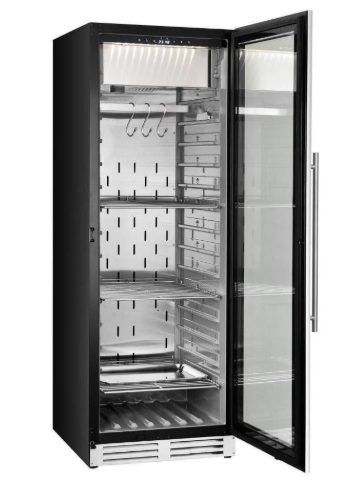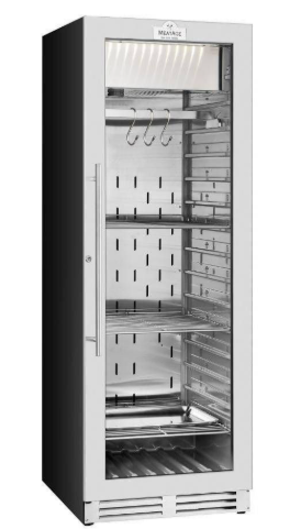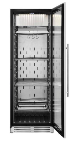 Шкаф для вызревания мяса предназначен для эксплуатации в бытовых условиях, а также в гостиницах, ресторанах, кафе и торговых предприятиях различных форматов. Он используется для охлаждения и поддержания необходимых параметров среды при созревании мясных изделий. Модель оборудована дверцей с замком и системой звукового оповещения. Корпус и элементы внутри изготовлены из пищевой нержавейки, дверца выполнена из закаленного стекла, устойчивого к механическим воздействиям.