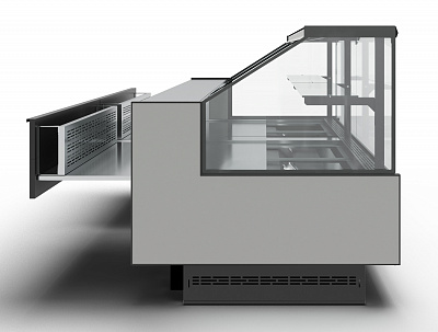 Гастрономическая витрина для использования в организациях общепита и в торговых залах магазинов применяется для охлаждения, недолгого хранения, демонстрации и реализации продуктов питания. В витрине удобно размещать салаты, молочную продукцию и различные гастрономические изделия, обеспечивая им необходимый температурный режим и хороший обзор для покупателей. Конструкция предусматривает дополнительный накопитель, который позволяет увеличить объем хранения и облегчает работу персонала при пополнении выкладки. Экспозиционная зона выполнена так, чтобы продукция была хорошо видна со стороны покупателей и легко доступна для обслуживания. Рабочая поверхность и столешница изготовлены из шлифованной нержавеющей стали – материала, устойчивого к износу, влаге и регулярной санитарной обработке, что важно для оборудования, используемого в сфере общественного питания.