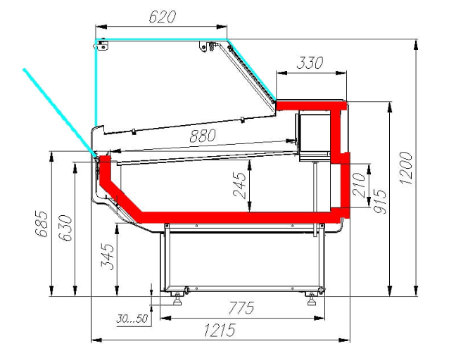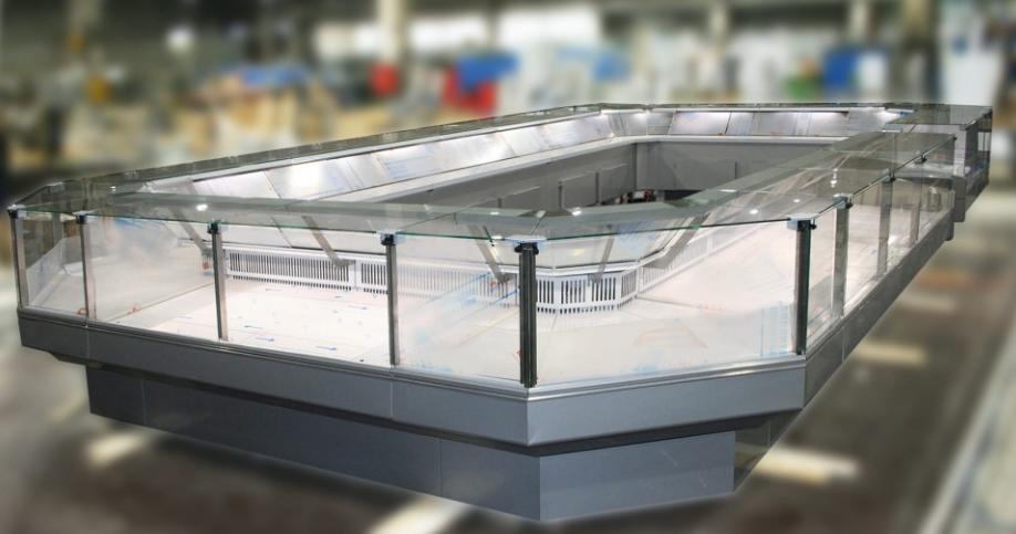 Холодильная камера для организаций общепита и торговли – это идеальный вариант для хранения, охлаждения, демонстрирования и реализации гастрономических изделий, салатов и других продуктов питания. Она оборудована Г-образным лицевым стеклопакетом с возможностью открывания, регулируемыми опорами высотой 3-5 см и специальным накопителем для продукции со стороны продавца. Полка изготовлена из анодированного алюминия, поверхность спереди – из окрашенной стали, а пространство для выкладки, обшивка испарителя и столешница – из шлифованной нержавейки. Модель можно стыковать в линию.