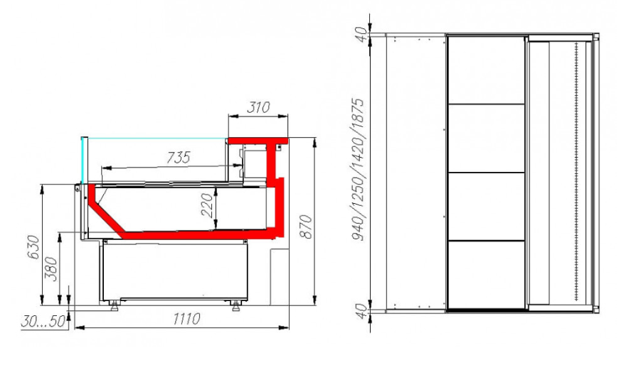 - 2-ступенчатые поддоны глубиной 48 см и 12 см, на которые выкладывают продукцию;