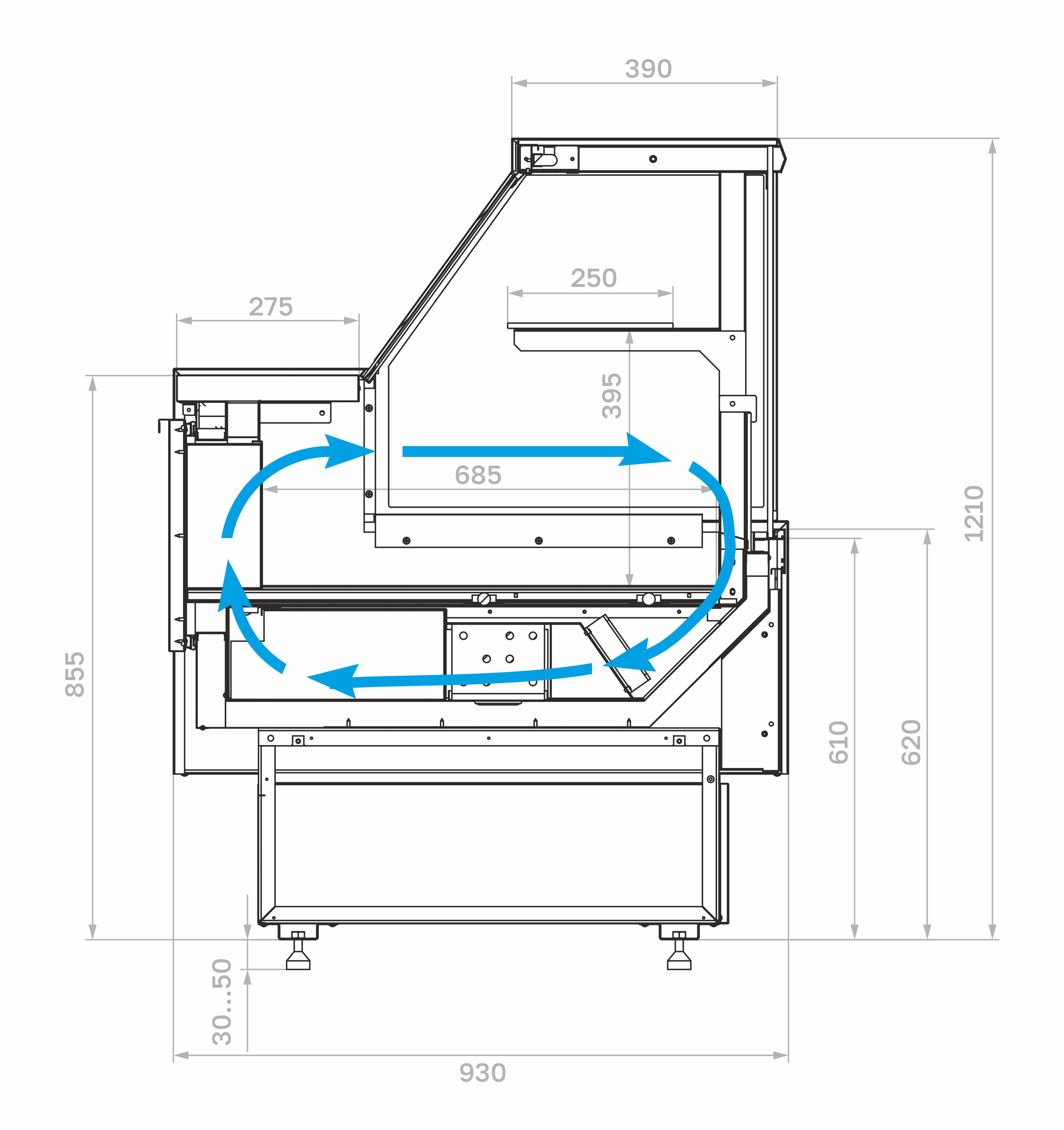 Конструкция включает в себя охлаждаемую камеру с прозрачными элементами, обеспечивающими хороший обзор выкладки. Внутри есть экспозиционная поверхность для размещения продуктов. Система охлаждения поддерживает стабильную температуру, что позволяет использовать витрину для гастрономии, салатов, молочных изделий, десертов и других скоропортящихся товаров.