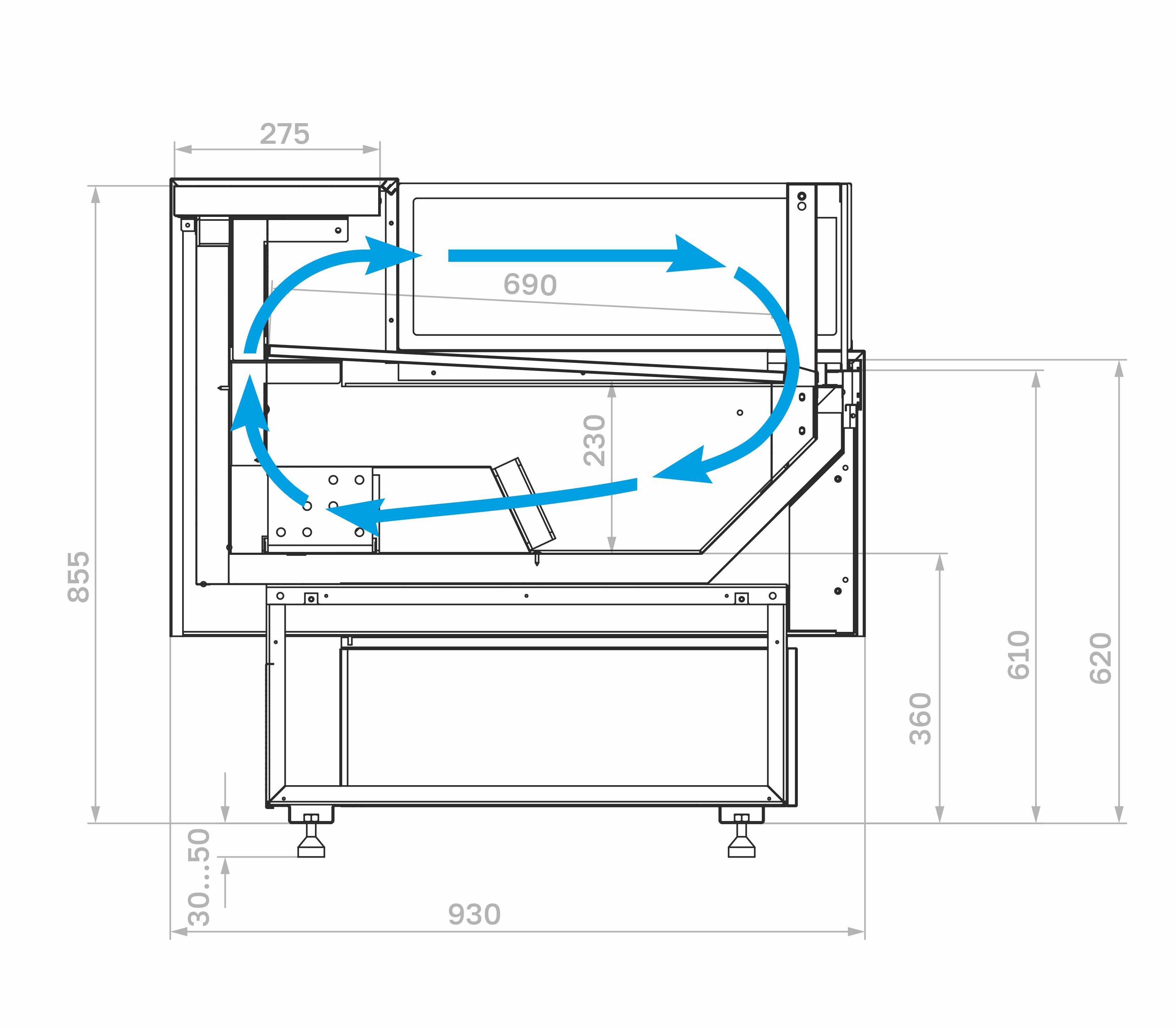 Конструкция включает в себя охлаждаемую камеру с прозрачными элементами, обеспечивающими хороший обзор выкладки. Внутри есть экспозиционная поверхность для размещения продуктов. Система охлаждения поддерживает стабильную температуру, что позволяет использовать витрину для гастрономии, салатов, молочных изделий, десертов и других скоропортящихся товаров.