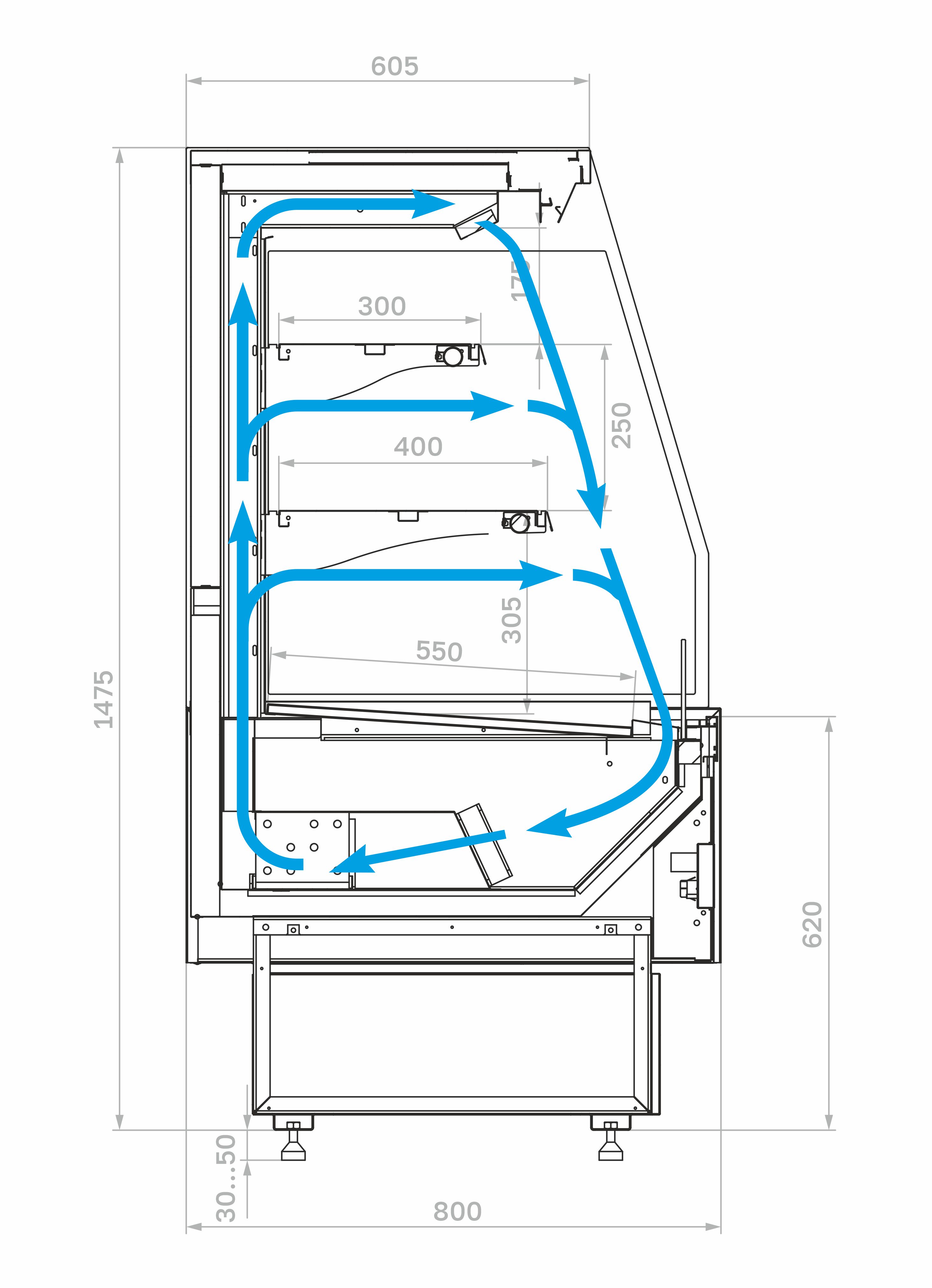 - регулируемые по высоте металлические полки с углом наклона 15 градусов;