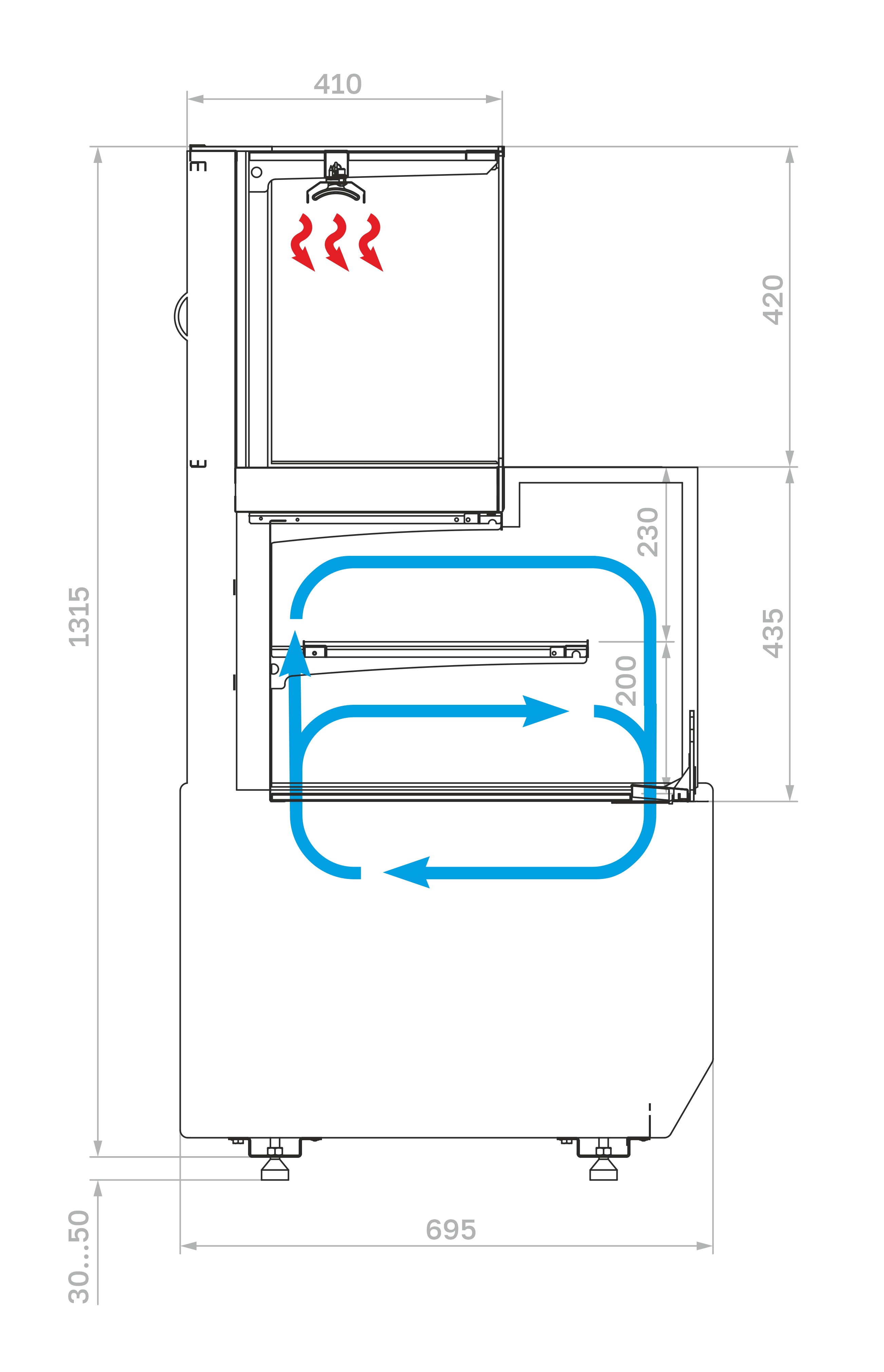 Корпус выполнен из стали с теплоизоляцией из пенополиуретана. Нижнее остекление выполнено из стеклопакетов, верхнее — из стекла. Верхняя часть дополнена задними раздвижными створками из стеклопакета, нижний отсек оснащен металлической задней стенкой, а полка нижнего объема выполнена из стекла. Нагревательные элементы верхнего отделения изготовлены из керамики.