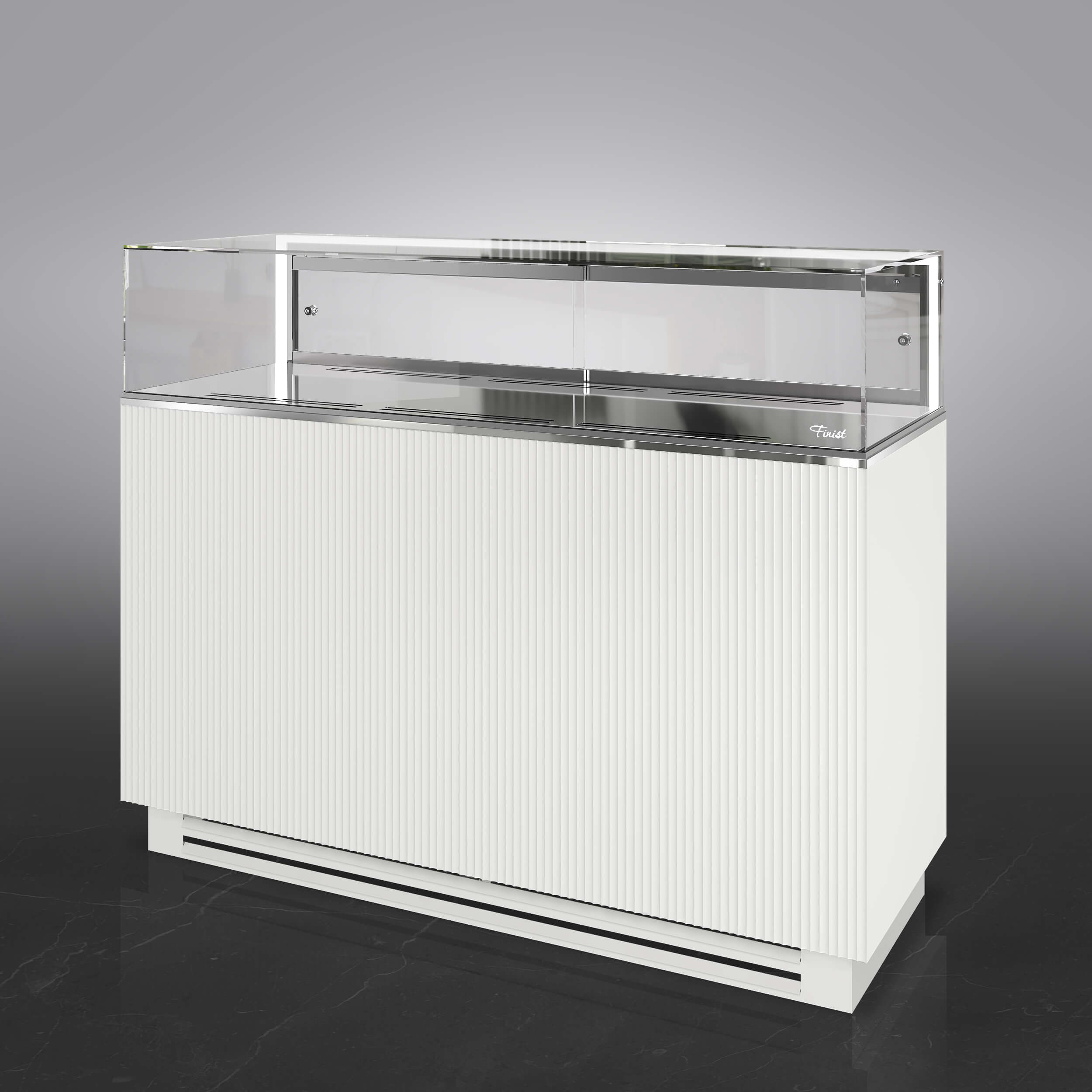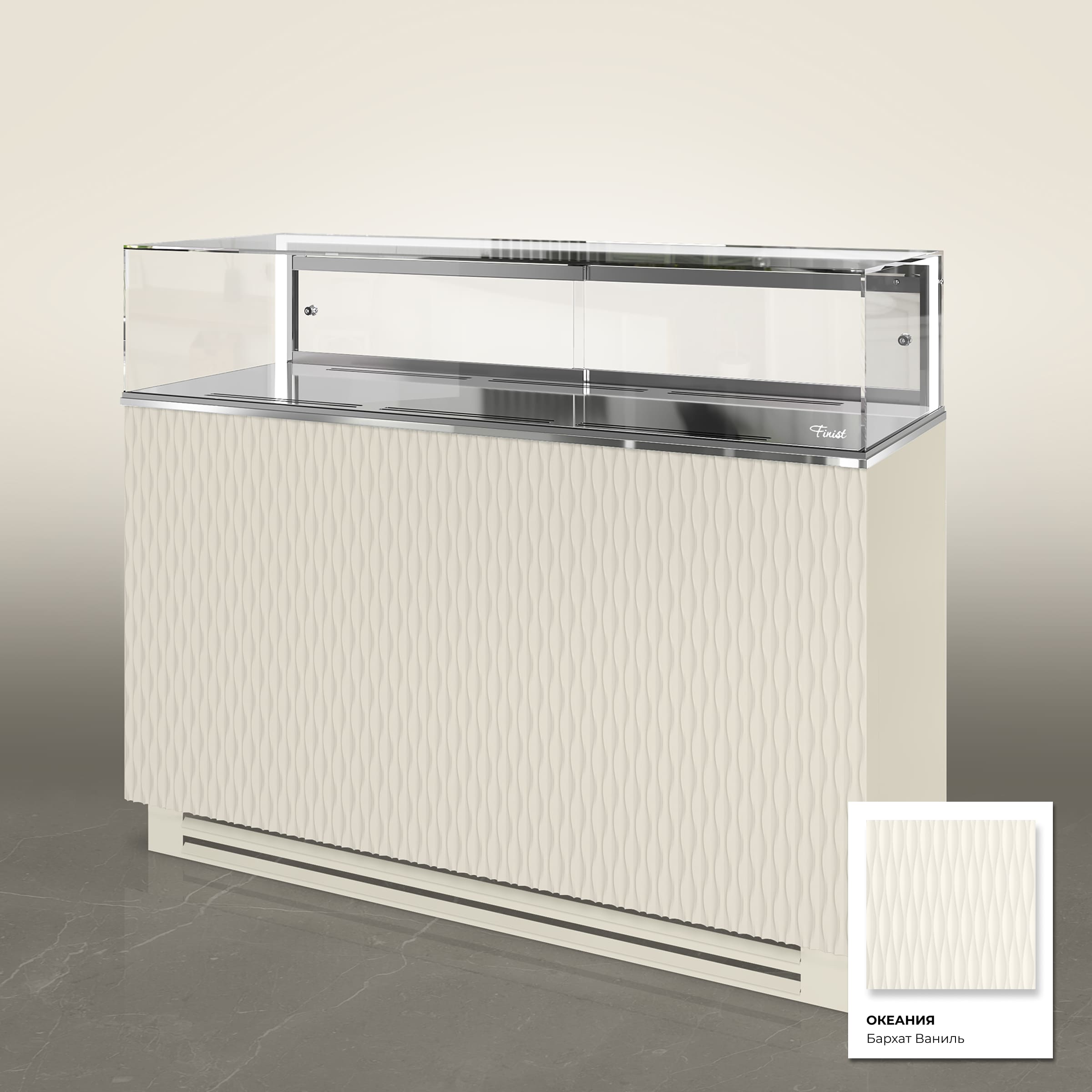 Витрина гармонично интегрируется в торговый интерьер благодаря фасадам, которые могут быть облицованы МДФ по выбору заказчика или окрашены в любой оттенок по каталогу RAL. Единая концепция серии LUX позволяет формировать кондитерские линии различной длины и конфигурации.