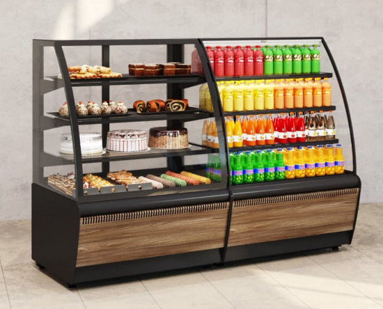 Напольная открытая витрина разработана для охлаждения, непродолжительного хранения и демонстрирования различных хлебобулочных и кондитерских изделий, десертов. Она подходит для ресторанов, кафетериев, кондитерских и прочих организаций общепита и торговли. Равномерное распределение по всему объему камеры обеспечивает динамическая охлаждающая система. У нее нет фронтального стекла. Сбоку у нее имеются прямые стекла, а раздвижные шторки сзади из органического стекла. Надежную термоизоляцию обеспечивает пенополиуретановая изоляция. Бока сделаны из пластика, а корпус – из пищевой стали. Устанавливать витрину рекомендуется не меньше 2 м от приборов отопления. Загораживать воздуховоды нельзя.