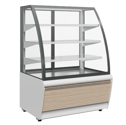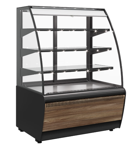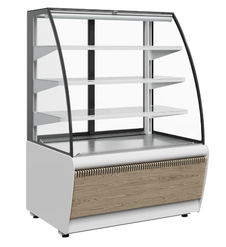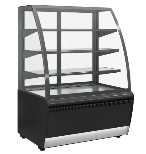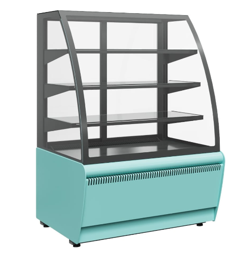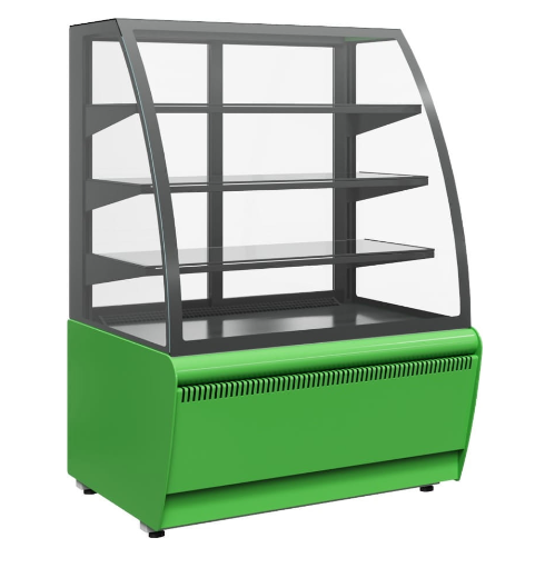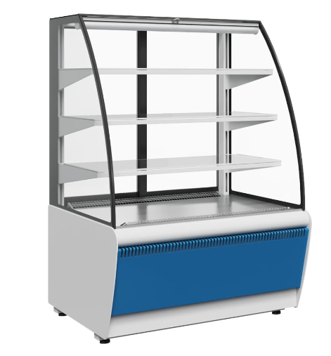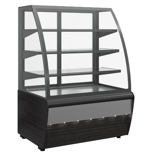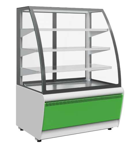 Напольная открытая витрина разработана для охлаждения, непродолжительного хранения и демонстрирования различных хлебобулочных и кондитерских изделий, десертов. Она подходит для ресторанов, кафетериев, кондитерских и прочих организаций общепита и торговли. Равномерное распределение по всему объему камеры обеспечивает динамическая охлаждающая система. У нее нет фронтального стекла. Сбоку у нее имеются прямые стекла, а раздвижные шторки сзади из органического стекла. Надежную термоизоляцию обеспечивает пенополиуретановая изоляция. Бока сделаны из пластика, а корпус – из пищевой стали. Устанавливать витрину рекомендуется не меньше 2 м от приборов отопления. Загораживать воздуховоды нельзя.