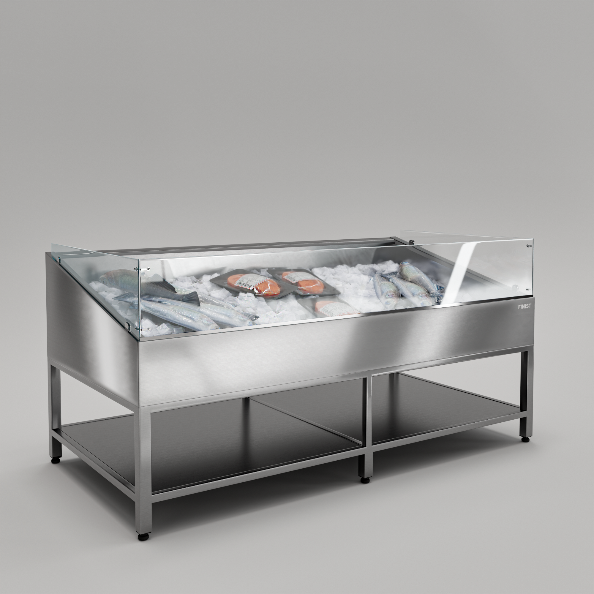 Нейтральная витрина предназначена для выкладки свежей рыбы на слое льда без использования встроенной системы охлаждения. Конструкция обеспечивает удобную и наглядную презентацию продукции, сохраняя ее привлекательный внешний вид за счет охлаждения льдом. Витрина подходит для торговых залов, рынков и предприятий общественного питания, где охлаждение организуется за счет регулярного пополнения льда. Простота устройства облегчает обслуживание и делает оборудование практичным решением для временной или сезонной торговли рыбой.