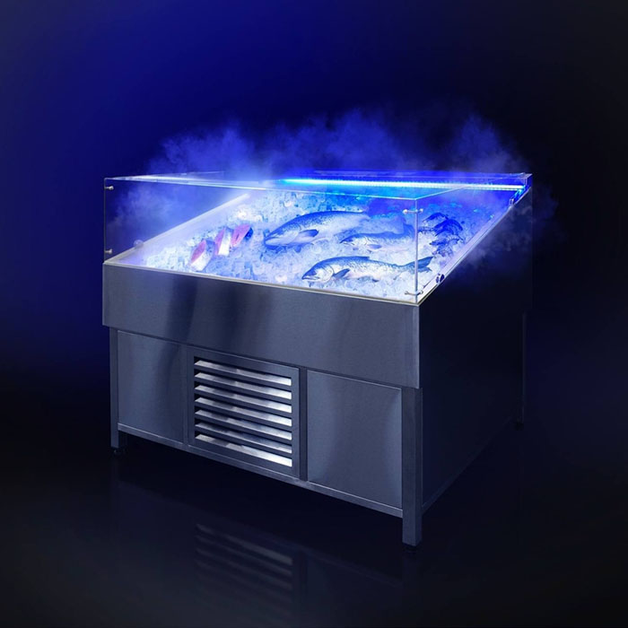 Витрина для охлаждения и презентации рыбы и морепродуктов на слое льда с сохранением их естественного внешнего вида. Для оптимального уровня влажности и свежести продукции предусмотрена система образования тумана на базе ультразвукового воздушного увлажнения. Микрокапли около 5 мкм образуют равномерный туман, который эффективно увлажняет продукты и может использоваться как в открытых, так и в закрытых витринах. Такое решение не только поддерживает товарный вид, но и делает выкладку более заметной для покупателей.
