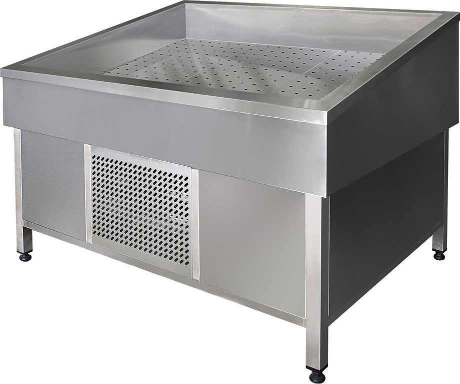 Витрина для выкладки свежей рыбы на слое льда с использованием системы принудительного охлаждения. Оборудование обеспечивает стабильное поддержание пониженной температуры, что помогает замедлить процессы порчи и сохранить естественный внешний вид продукции в течение всего времени экспозиции. Наклонная конструкция улучшает обзор содержимого, делая выкладку более наглядной для покупателей.