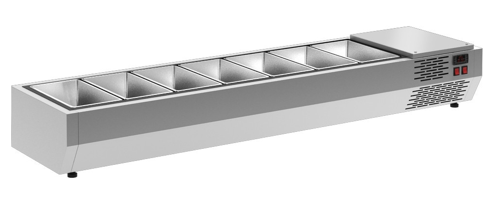 Холодильная витрина – это открытое оборудование, в котором охлаждают, непродолжительно хранят и демонстрируют уже приготовленные блюда, ингредиенты для пиццы и салатов. Его можно установить в качестве дополнительного элемента прилавков, стоек в баре, столов для пиццы и холодильных столов. Витрина подходит для эксплуатации в любых заведениях общепита и торговли. Экспозиционная поверхность и корпус сделаны из пищевой нержавейки. Благодаря пенополиуретановой изоляции, достигается уменьшение потребления электрической энергии и поддержание установленного температурного режима. В комплектацию не включены гастрономические емкости. Витрина вмещает в себя три гастрономические емкости GN1/3, а при помощи перемычек, которые входят в комплект, можно установить изделия меньшего размера.
