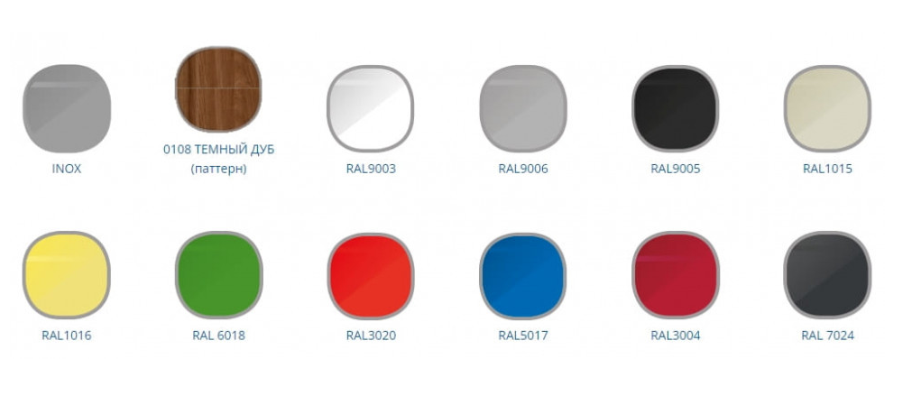 - оригинальные цветовые решения: Inox, алюминиево-белый, черный глубокий, белый сигнальный, серо-графитовый, зелено-желтый, красно-пурпурный, желтая сера, слоновая светлая кость, темный дуб, транспортный синий, красный или желтый;