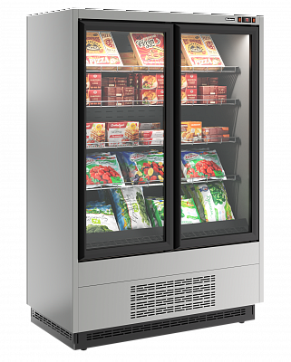 Холодильная витрина – это пристенная горка с комбинированным температурным режимом: от 0С° до +7С°. Она отличается минималистичным стильным дизайном. Витрина имеет фронт из двухкамерного стеклопакета с подогревом рамы двери и стеклопакета. Такая модель универсальна и подходит для залов самообслуживания. В них можно выставлять фрукты, молочные продукты, напитки, сыр, консервы, колбасы, пресервы, а также овощные, рыбные и мясные полуфабрикаты.