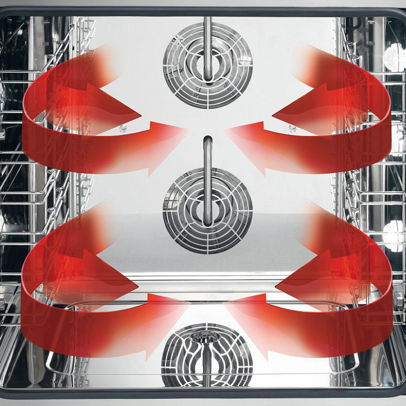 - Динамическое распределение воздушного потока с использованием автореверсивных двигателей обеспечивают равномерное приготовление во всех лотках;