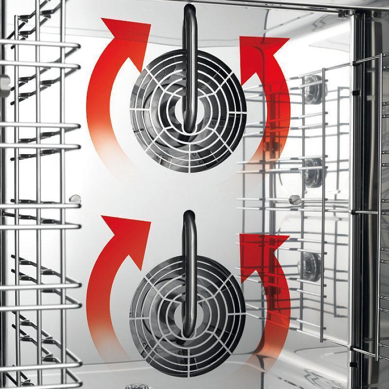 • Динамическое распределение воздушного потока с использованием автореверсивных двигателей обеспечивают равномерное приготовление во всех лотках;