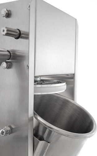 Вертикальный колбасный шприц – оборудование для наполнения оболочек мясным фаршем с помощью вертикального расположения цилиндра. Такая конструкция обеспечивает удобство работы с большими объемами и стабильное равномерное заполнение без воздушных пустот. Механизм подачи фарша позволяет точно регулировать скорость и плотность наполнения, а устойчивое вертикальное положение облегчает загрузку продукта и обслуживание прибора. Вертикальный шприц применяют на мясных производствах, в цехах общественного питания и на предприятиях, выпускающих колбасы, сосиски и другие фаршевые изделия.