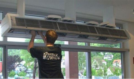 Чаще всего используется горизонтальный способ установки над оконным или дверным проёмом. Основное назначение тепловых завес – уменьшение возможных тепловых потерь в холодное время года, создавая поток тёплого воздуха. Установку тепловой завесы необходимо производить как можно ближе к проёму, а подключение тепловой завесы должен выполнять только квалифицированный электрик.