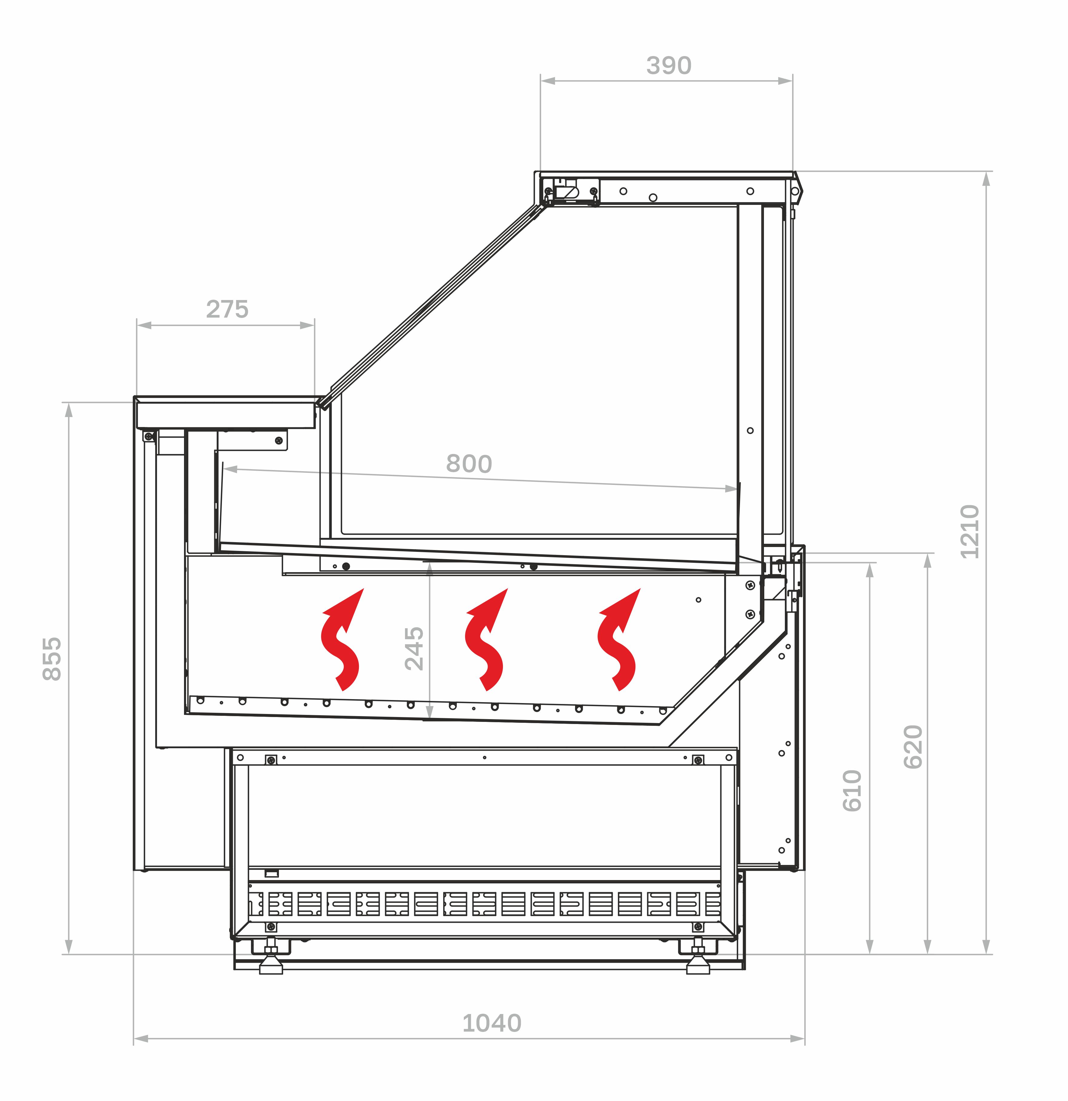 Конструкция предусматривает рабочую камеру с прозрачными элементами, через которые хорошо видна выкладка. Внутреннее пространство используется для размещения гастрономических емкостей, подносов или противней с готовыми блюдами. Нагревательные элементы поддерживают необходимый температурный режим, обеспечивая равномерное распределение тепла внутри витрины.