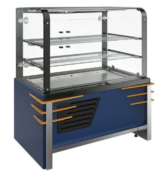 Неохлаждаемая витрина предназначена для использования в составе раздаточных линий. В ней недолго можно хранить и раздавать различных кондитерские изделия. Особенность такой витрины состоит в скругленных полках из стекла на стойках из металла. Благодаря такому дизайну она не отвлекает на себя внимание и отлично гармонирует с фасадом, не мешая выбору продукции. Витрина имеет рейлинги из натурального дерева с металлическими проставками.